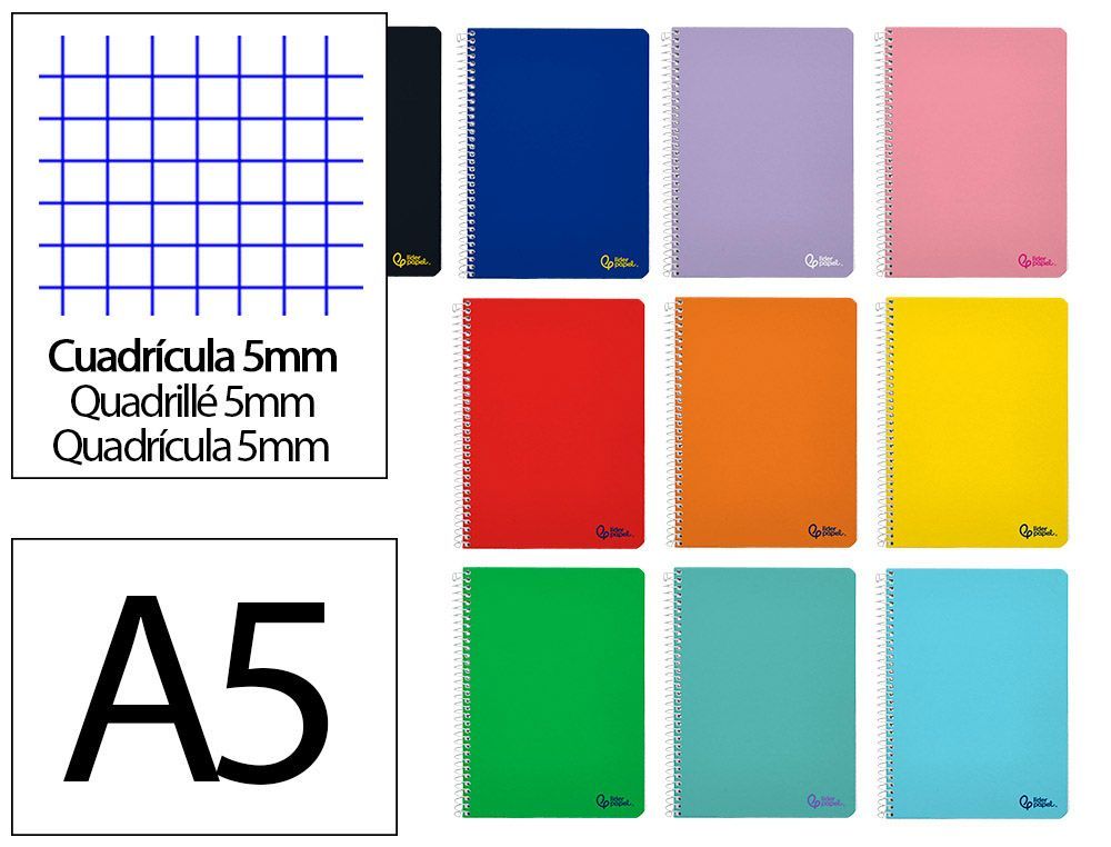Cuaderno espiral Liderpapel A5 con tapa blanda en múltiples colores, ideal para estudiantes y profesionales. Papel de 75 gramos con cuadricula de 5 mm y doble margen. Incluye 80 hojas y 6 taladros para archivador. Diseño funcional y compacto para llevar en mochila o bolso.