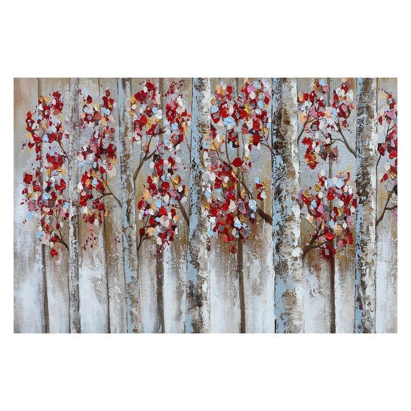 Cuadro de paisaje en otoño de 120 x 80 cm, ideal para decorar salas, comedor o pasillos. Pintura al óleo sobre lona con textura artesanal, representando árboles con hojas rojas y naranjas sobre troncos blancos y grises. Estilo abstracto y natural, perfecto para amantes de la naturaleza y la decoración moderna.