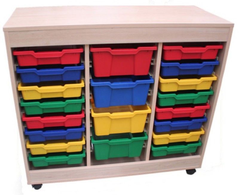 Cubetero doble acceso con estructura de madera clara y cajones organizadores de plástico en colores rojo, azul, amarillo y verde. Ideal para espacios de trabajo, talleres o escuelas. Diseño modular con ruedas para fácil movilidad. Organiza herramientas, materiales escolares o suministros con estilo y funcionalidad.