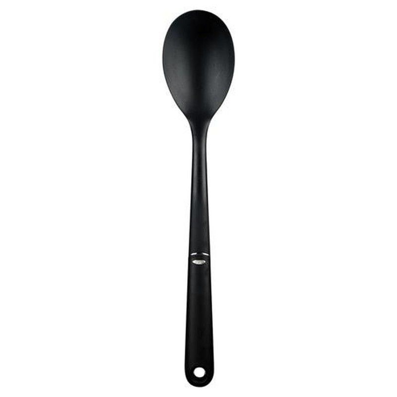Cuchara de cocina de 37 cm en nylon negro, ideal para mezclar, servir y cocinar sin dañar ollas y sartenes. Diseño ergonómico de OXO Good Grips para mayor comodidad y agarre seguro. Resistente al calor y fácil de limpiar. Perfecta para uso diario en cualquier cocina.