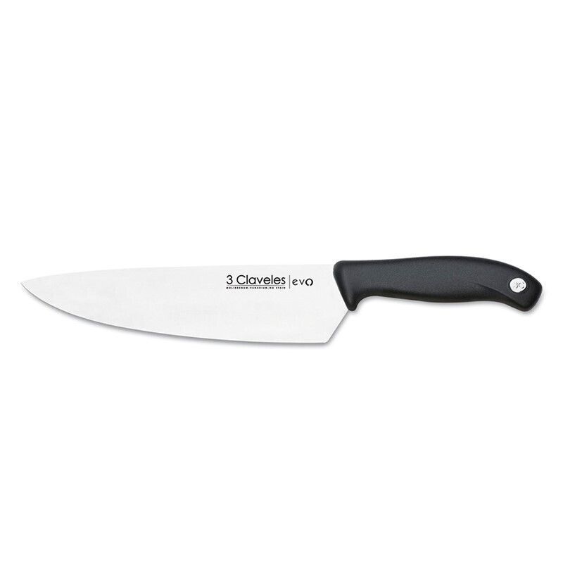 Cuchillo de cocina profesional de 20 cm de la marca 3 Claveles evo, con hoja de acero inoxidable de alta calidad y mango negro ergonómico en plástico antideslizante. Ideal para cortar, picar y filetear con precisión. Diseño robusto y funcional para cocineros en casa o profesionales. Resistente y fácil de limpiar.