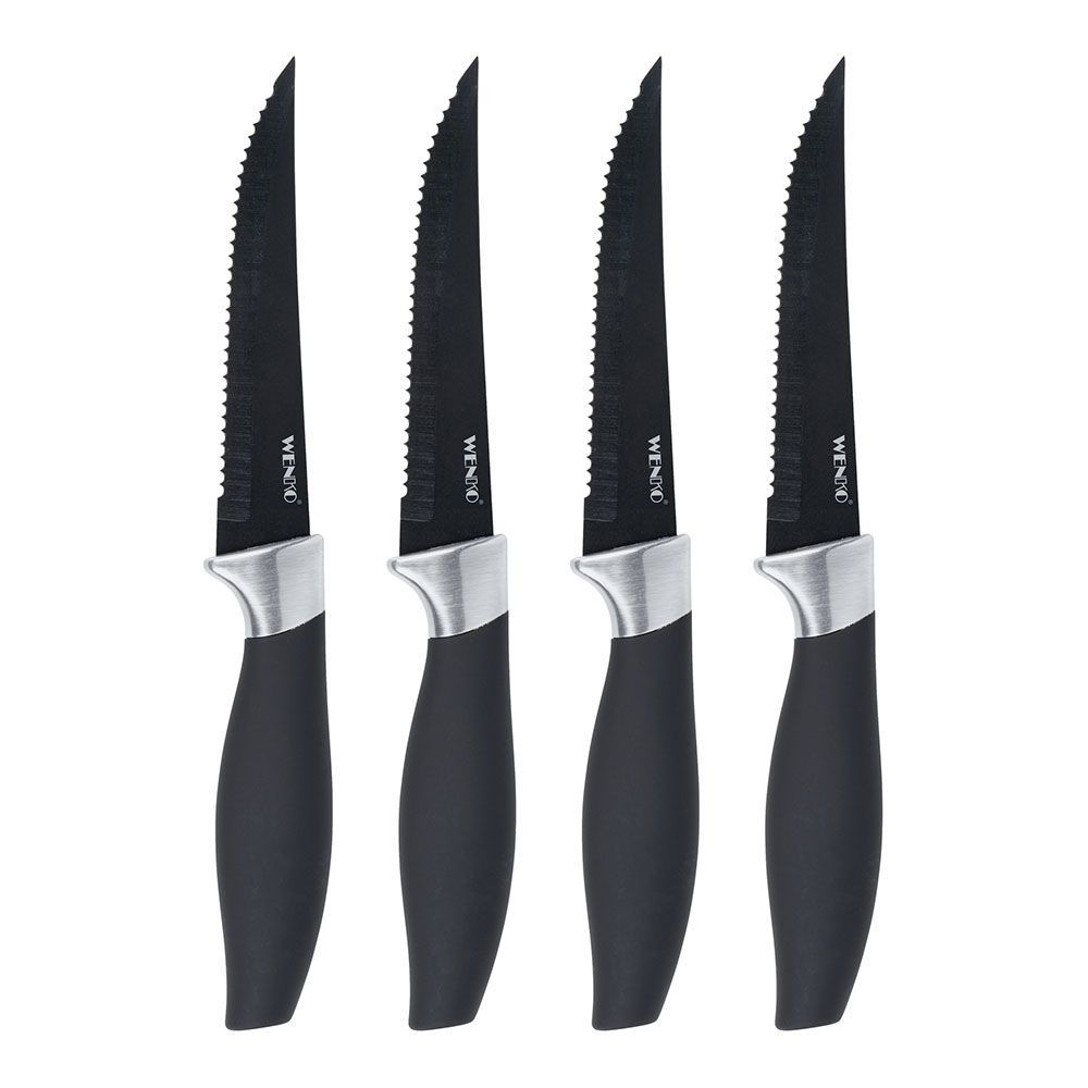 Juego de 4 cuchillos para carne Otis de Wenko, con hojas dentadas de acero inoxidable y mangos ergonómicos de plástico negro con detalles plateados. Diseño moderno y resistente, ideal para cortar carne con precisión y comodidad en la cocina. Perfecto para uso diario en hogares y cocinas profesionales.