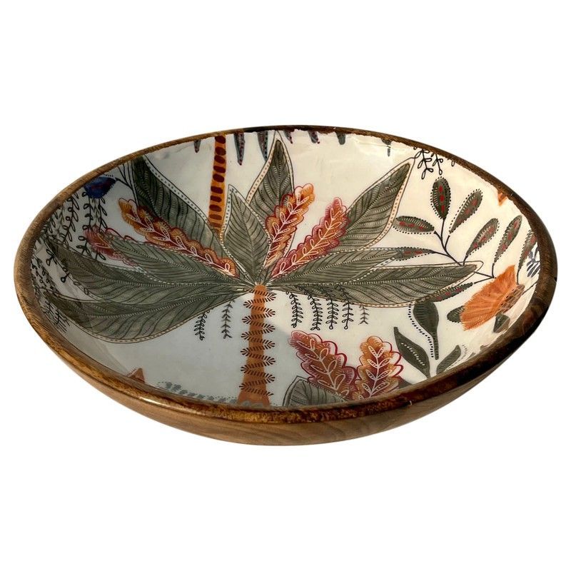 Cuenco decorativo grande de madera con diseño de hojas tropicales pintadas a mano. Ideal para decorar mesas, servir frutas o como pieza central en tu hogar. Con acabado rústico y colores naturales, aporta un toque bohemio y elegante. Perfecto para amantes de la decoración étnica y natural.
