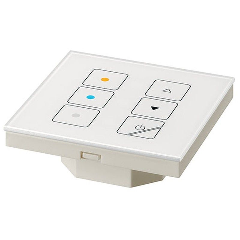Panel táctil Dali Basic Tw para control de iluminación en hogar inteligente. Diseño elegante y minimalista en blanco con botones sensibles al tacto. Ideal para regular intensidad y escenas de luz con comodidad. Fabricado en plástico de alta calidad, perfecto para integrar en sistemas de iluminación DALI. Control intuitivo con iconos claros y colore