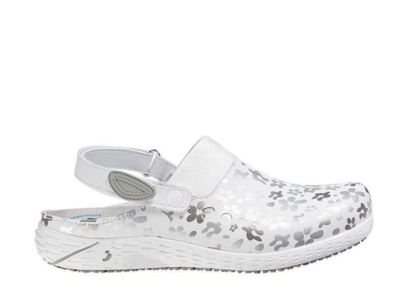 Zapatilla profesional DANY print silver de Safety Jogger, ideal para personal sanitario y profesionales de la salud. Con estampado floral plateado sobre fondo blanco, suela antideslizante y correa ajustable para un ajuste seguro. Fabricada en plástico y goma, ofrece comodidad y protección durante largas jornadas. Diseño higiénico y resistente, perf