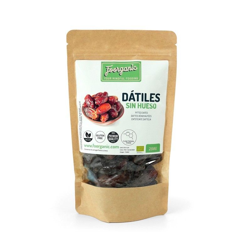 Dátiles sin hueso de 250 g de Foorganic, ideales para un consumo saludable y consciente. Orgánicos, veganos y sin gluten, estos dátiles son una opción natural y energética para snacks diarios, batidos o recetas saludables. Envase de cartón con ventana transparente que muestra el producto. Perfectos para amantes de la alimentación consciente y libre