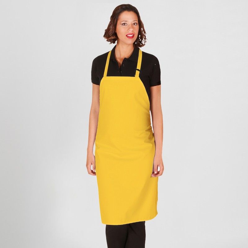 Delantal con peto de 90x75 cm en sarga amarilla, ideal para cocineros, meseros o trabajadores de servicios. Diseño funcional con cintas ajustables en los hombros para un ajuste cómodo. Fabricado en sarga resistente, fácil de limpiar y duradero. Perfecto para uso en restaurantes, cafeterías o hogar. Protege tu ropa durante tareas de cocina o prepara