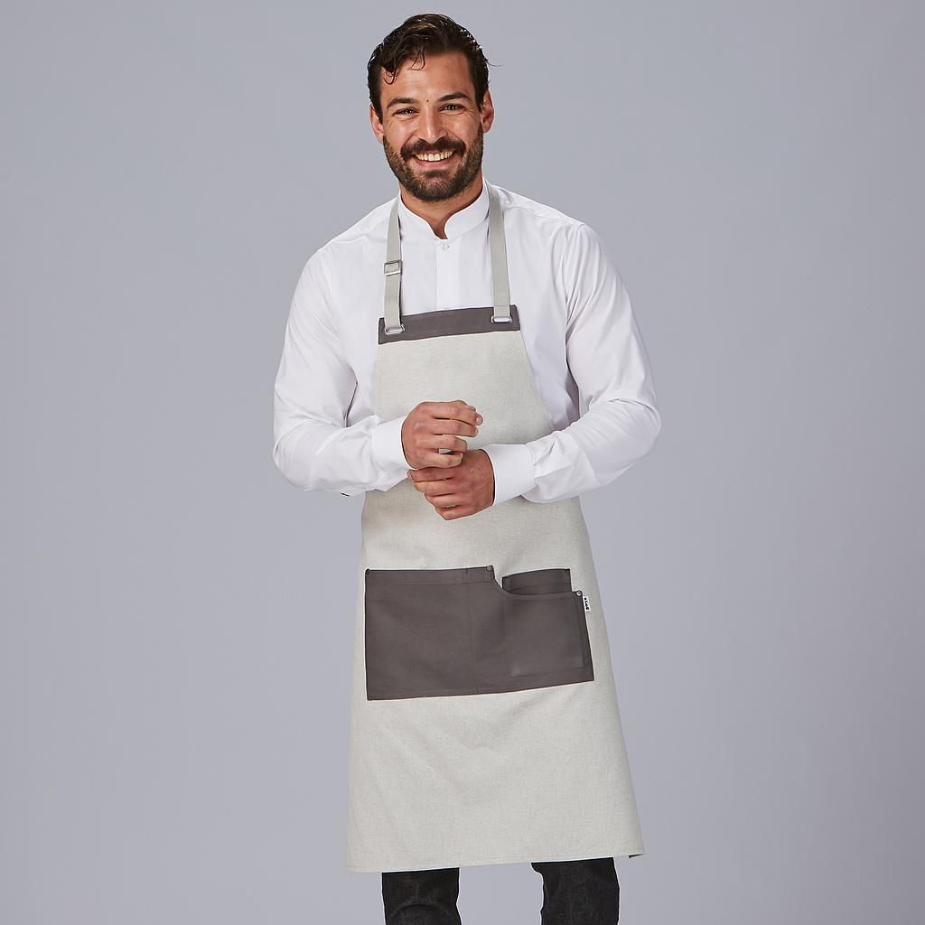 Delantal peto bicolor en lona, combinando blanco y gris, ideal para cocineros, baristas o profesionales de la hostelería. Con bolsillos frontales y cinturón ajustable, ofrece comodidad y estilo. Resistente y fácil de limpiar, perfecto para uso diario en cocina o servicio.