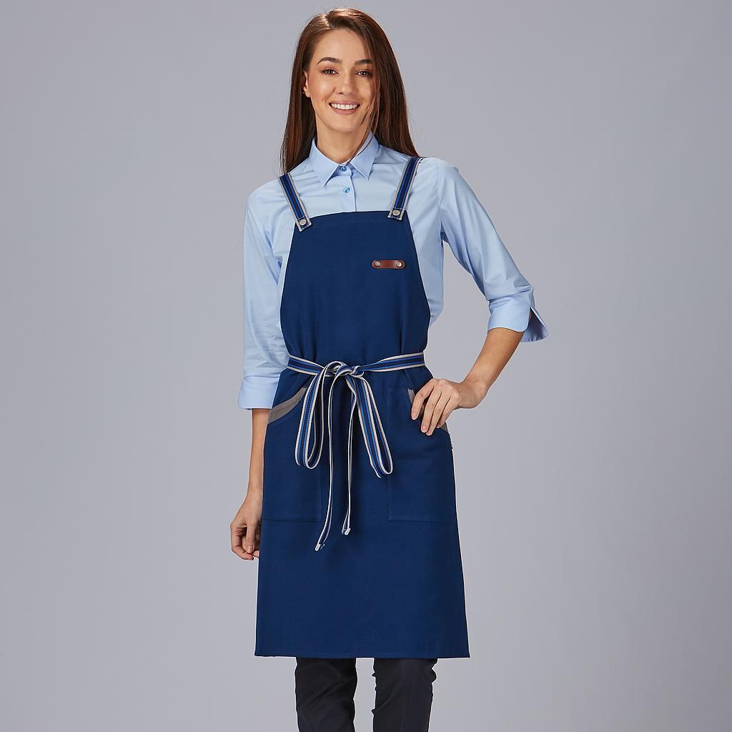 Delantal peto de alta calidad en color azul marino con detalles en rayas blancas, ideal para profesionales del servicio de comida. Fabricado en mezcla de algodón y poliéster, ofrece comodidad y durabilidad. Incluye bolsillos frontales y cinturón ajustable para un ajuste perfecto. Perfecto para cocineros, meseros y empleados de restaurantes.
