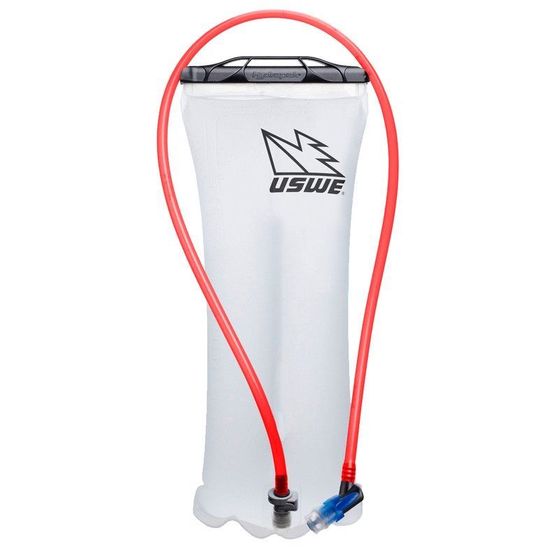 Depósito de bebida USWE Elite de 3.0L, ideal para ciclistas y deportistas que necesitan hidratación durante actividades al aire libre. Fabricado en plástico resistente y con tubo rojo flexible y válvula azul para un flujo cómodo. Diseño transparente con logo negro y tapón negro con rejilla. Perfecto para mochilas de hidratación, garantiza durabilid