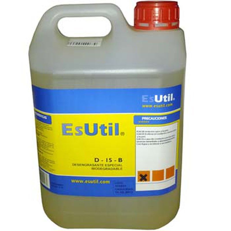 Desengrasante especial biodegradable D-15 B de EsUtil, ideal para limpiar superficies grasosas en cocina, taller o garaje. Fórmula eficaz y respetuosa con el medio ambiente. En botella de 5 litros con tapón rojo para uso profesional o doméstico. Perfecto para eliminar grasa y suciedad sin dañar superficies.