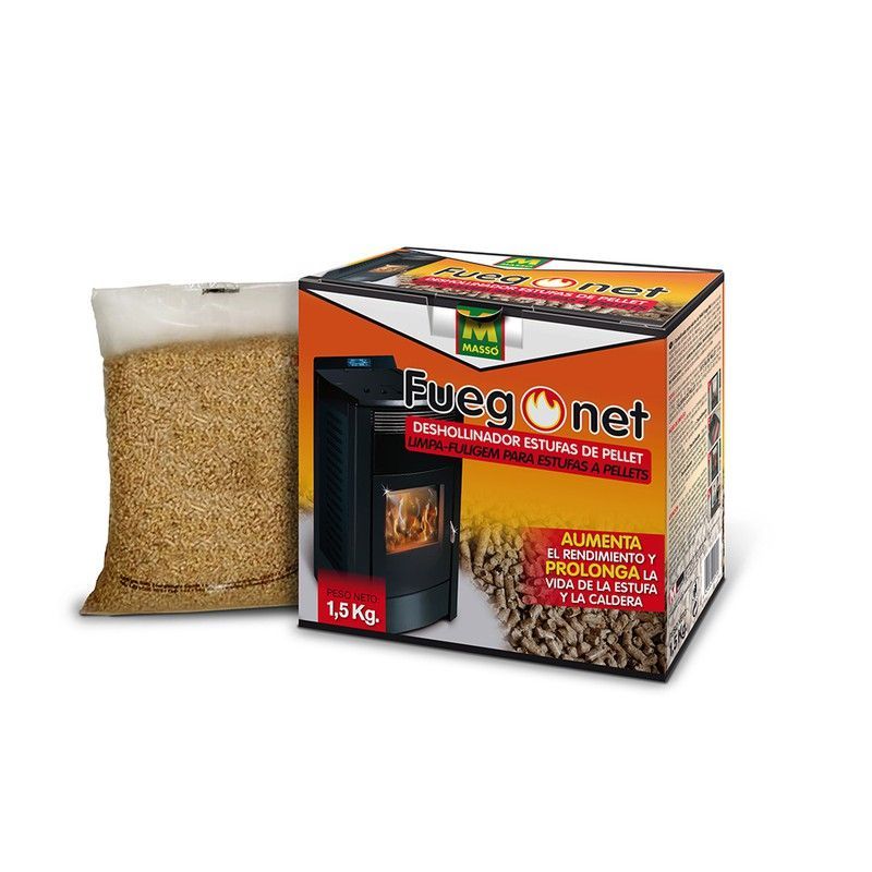 Deshollinador de pellet Fuegonet de 1,5 kg, ideal para mantener limpias las estufas y calderas de pellet. Aumenta el rendimiento y prolonga la vida útil del equipo. Presentado en caja rectangular con diseño naranja y negro, incluye imagen de estufa y pellets. Producto esencial para el mantenimiento de sistemas de calefacción por pellet.