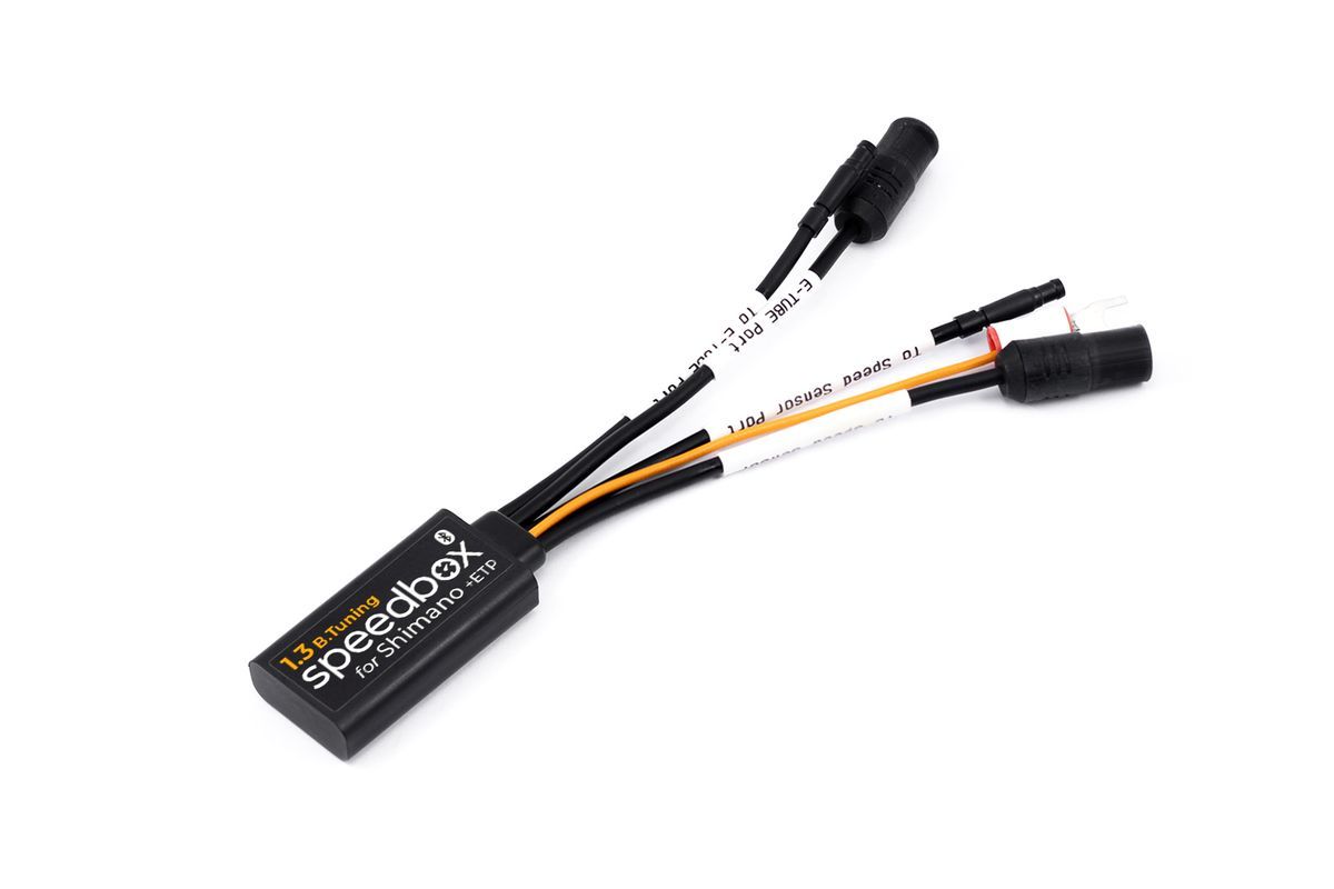 Deslimitador SPEEDBOX 1.3 B.Tuning para bicicletas eléctricas Shimano EP8, compatible con E-TUBE PORT. Permite aumentar la velocidad máxima y mejorar el rendimiento del motor. Fabricado en plástico y metal, con cables de conexión seguros y conectores JST. Ideal para ciclistas que buscan más potencia y control en sus bicicletas eléctricas.