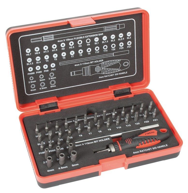 Juego de destornilladores precisión RATIO de 39 piezas en estuche naranja y negro. Ideal para trabajos de bricolaje, reparaciones electrónicas y mecánicas precisas. Incluye manija de carraca y múltiples puntas organizadas en compartimentos. Perfecto para profesionales y aficionados al mantenimiento de dispositivos pequeños y herramientas de precisi