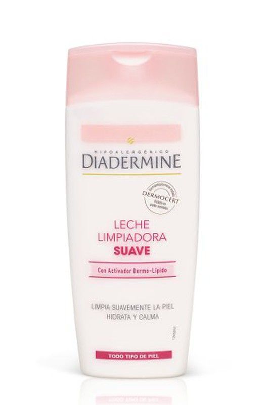 Diadermine Leche Limpiadora Suave, ideal para todo tipo de piel. Fórmula hipoalergénica que limpia suavemente, hidrata y calma la piel. Con activador dermo-lípido para una limpieza delicada y efectiva. Perfecta para uso diario, especialmente recomendada para pieles sensibles. Envase de 200 ml con tapa rosada y diseño limpio y profesional.