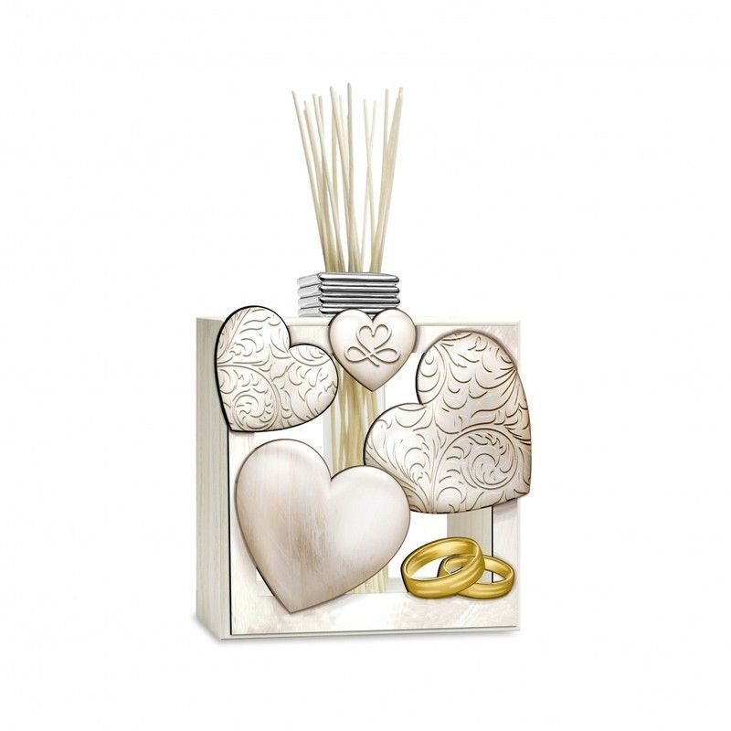 Difusor conmemorativo de 14x16,5 cm con diseño romántico de corazones plateados y anillos dorados, perfecto para bodas o aniversarios. Embalaje elegante con acabado decorativo, ideal como regalo para parejas. Contiene varillas de difusión para ambientar espacios con aroma suave y duradero. Un detalle sofisticado para celebrar el amor.