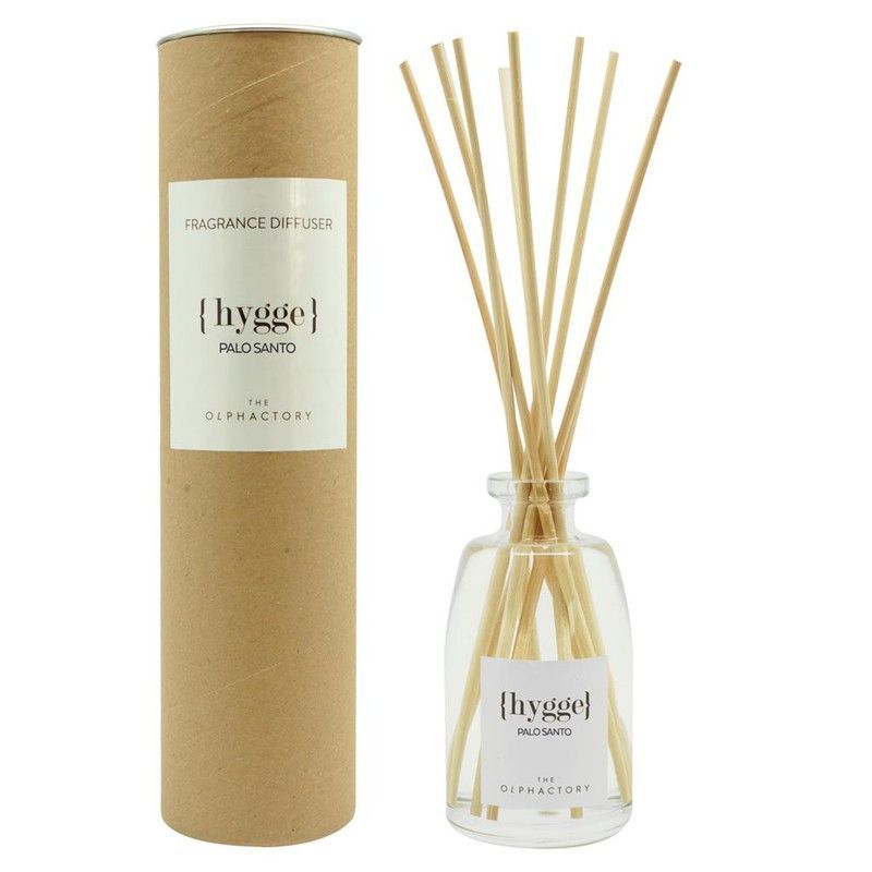 Difusor de fragancia 'Hygge Palo Santo' de The Olphactory, ideal para ambientar espacios con un aroma cálido y relajante. Presentado en un frasco de vidrio transparente con varillas de madera y su elegante tubo de cartón kraft. Perfecto para hogares que buscan un toque escandinavo y sofisticado. Contenido: 250 ml.