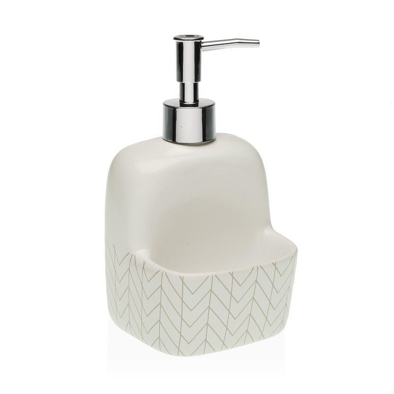 Dispensador de cocina Eris Versa en cerámica blanca con elegante diseño de zigzag en la base. Equipado con pompa de acero inoxidable para un uso higiénico y cómodo. Ideal para jabón líquido, aceite o vinagre en la cocina. Estética moderna y funcional para cualquier encimera.