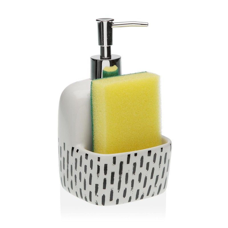 Dispensador de cocina Lauren en porcelana con diseño geométrico de puntos negros sobre fondo blanco. Incluye tapón de acero inoxidable y soporte para esponja, ideal para mantener tu cocina organizada y con estilo. Perfecto para uso diario en el fregadero, combina funcionalidad y diseño moderno.