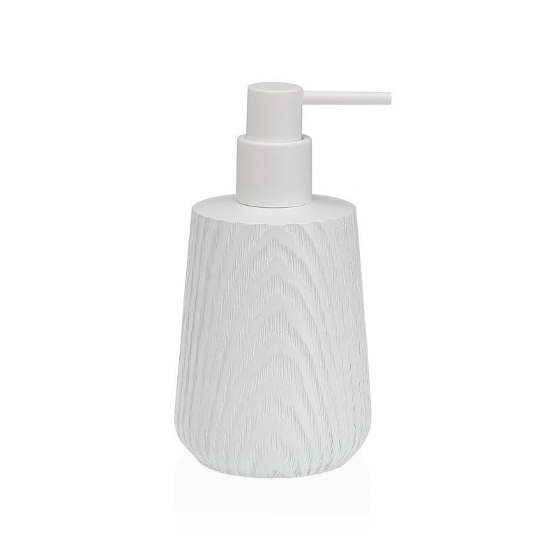 Dispensador de baño blanco con efecto madera, ideal para baños modernos y rústicos. Diseño elegante y funcional con pompa de plástico blanco. Perfecto para dispensar jabón líquido, gel de ducha o loción. Aporta un toque natural y sofisticado a tu cuarto de baño.