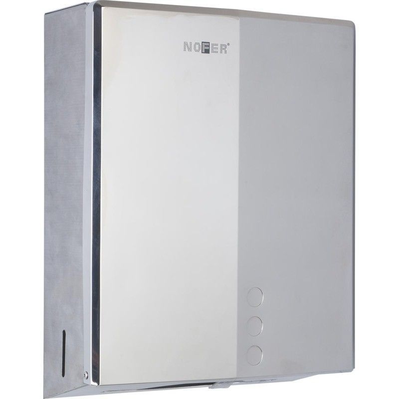 Dispensador de papel brillo serie EVO de NOFER, fabricado en acero inoxidable de alta calidad. Diseño moderno y elegante con acabado metálico brillante, ideal para baños públicos, oficinas o espacios comerciales. Fácil instalación y uso, con panel frontal en tonos plateado y blanco. Robusto y resistente a la corrosión, garantiza durabilidad y un as
