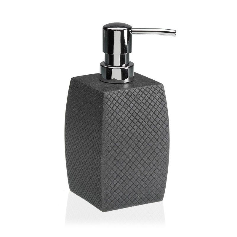 Dispensador de jabón gris con acabado texturizado en rejilla y pompa de acero inoxidable. Ideal para baños modernos, combina funcionalidad y estilo. Fácil de usar y mantener, perfecto para espacios elegantes y contemporáneos.