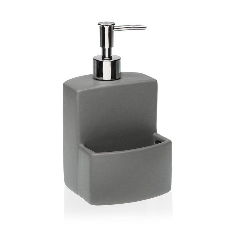 Dispensador de cocina en cerámica gris con pompa de acero inoxidable. Diseño moderno y funcional con compartimento inferior para cepillo o esponja. Ideal para mantener tu cocina organizada y con estilo. Fácil de limpiar y resistente al uso diario.