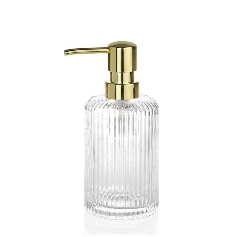 Dispensador vintage de vidrio transparente con pompa dorada, ideal para jabón líquido o loción en el baño. Diseño elegante con rayas verticales y acabado sofisticado. Perfecto para decorar tu lavabo con estilo clásico y funcional. Fácil de usar y limpiar. Capacidad de 280ml.