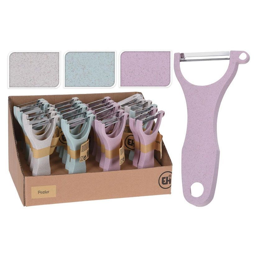 Display de 24 peladores de cocina en colores surtidos: blanco, azul claro y rosa. Fabricados en plástico resistente y acero inoxidable, ideales para pelar frutas y verduras con facilidad. Diseño ergonómico y compacto, perfecto para uso diario en la cocina. Ideal para restaurantes, tiendas o regalos. Incluye caja de cartón para exhibición.
