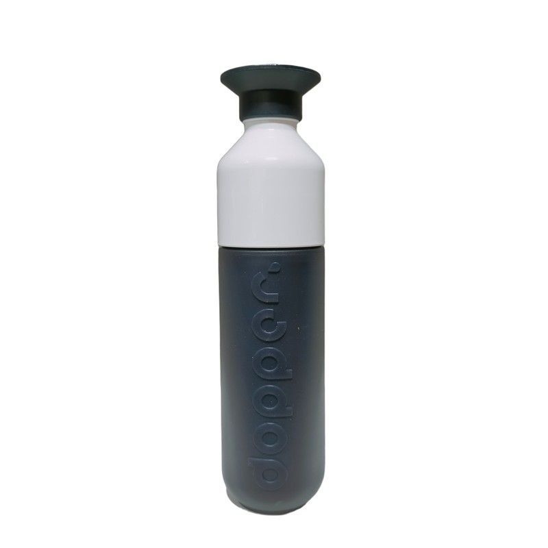 Botella de agua Dopper Original de 450 ml en color Dark Spring, con diseño bicolor blanco y gris oscuro. Fabricada en plástico resistente y ligero, ideal para llevar en el día a día. Su tapón negro asegura un cierre hermético y su forma ergonómica facilita el transporte. Perfecta para deportistas, estudiantes y profesionales que buscan una opción s