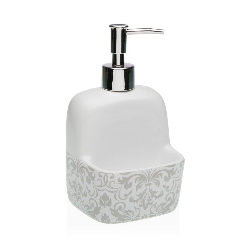 Dosificador de cocina Damasco con elegante diseño de damasco en tonos grises sobre fondo blanco. Cuenta con una pompa metálica cromada y forma cuadrada con bordes redondeados. Ideal para dispensar aceite, vinagre o sabores en la cocina. Su acabado mate y diseño sofisticado lo convierten en un accesorio funcional y decorativo para cualquier encimera