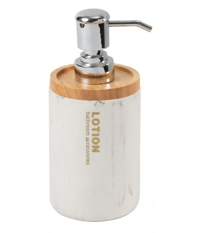 Dosificador de baño con diseño elegante y moderno, ideal para baños de estilo rústico o escandinavo. Fabricado con cuerpo de acabado blanco tipo mármol y tapa de madera natural, con pompa de acero inoxidable cromado. Perfecto para dispensar loción, jabón líquido o gel de manos con estilo. Fácil de limpiar y mantener. Añade un toque sofisticado a tu