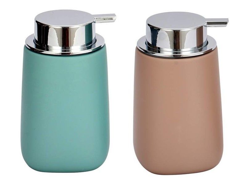 Dosificador de baño Dolomite con diseño elegante y moderno, ideal para baños con estilo. Cuerpo en plástico mate en tonos verde y marrón, con tapa de acero inoxidable brillante y palanca lateral para dispensar fácilmente. Perfecto para jabón líquido, gel de ducha o loción. Combina funcionalidad y estética en tu cuarto de baño.