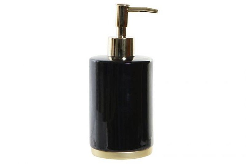 Dosificador de jabón para baño en cerámica negra con acabado brillante y pompa metálica dorada. Ideal para baños modernos y elegantes, combina funcionalidad con estilo. Fácil de usar y mantener, perfecto para jabón líquido o gel de manos. Aporta un toque sofisticado a tu espacio de higiene personal.
