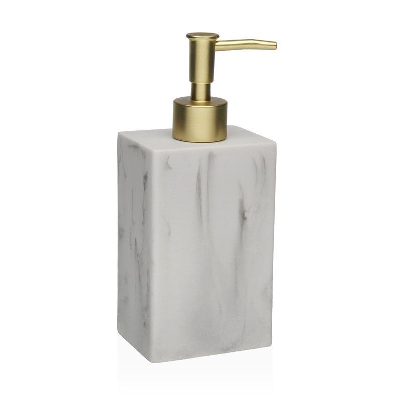 Dosificador de jabón Anahi Versa con efecto mármol blanco y pompa dorada. Fabricado en mármol y metal, combina elegancia y funcionalidad para tu baño. Perfecto para espacios modernos y sofisticados. Fácil de usar y de limpiar. Aporta un toque de lujo a tu rutina diaria.