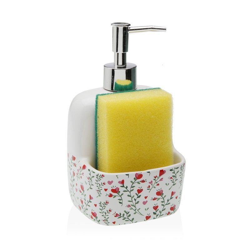 Dosificador Lover Versa con diseño floral en blanco, rojo y verde, ideal para cocina y baño. Incluye soporte para esponja amarilla con borde verde. Fabricado en plástico y acero inoxidable, ofrece estilo y funcionalidad. Perfecto para mantener tu espacio organizado y con un toque decorativo.