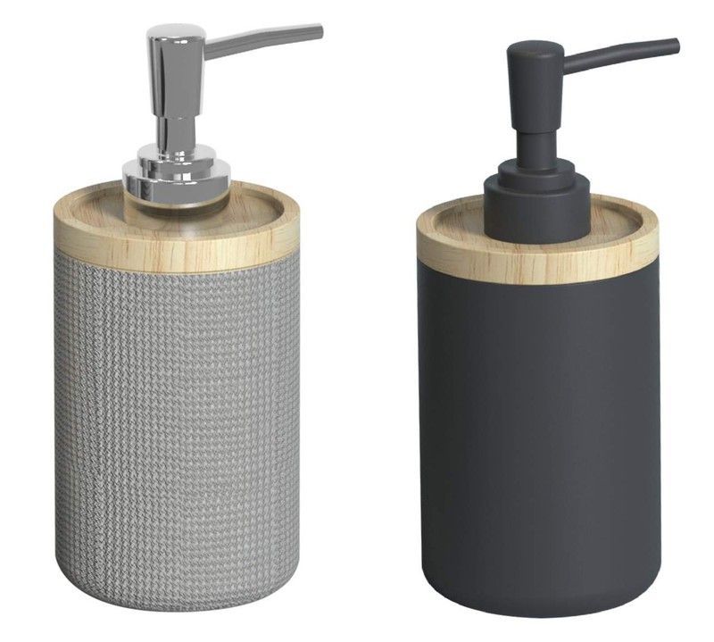 Dosificador de baño con diseño moderno y elegante, disponible en gris texturizado y negro liso. Fabricado con madera natural, acero inoxidable y plástico de alta calidad. Ideal para baños contemporáneos, ofrece un toque decorativo y funcional. Perfecto para dispensar jabón líquido, gel o loción con estilo y comodidad.