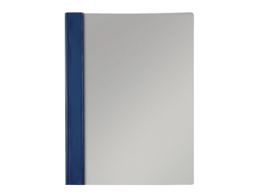 Dossier Fastener Esselte de folio en plástico y metal, con tapa gris y lomo azul marino. Ideal para organizar documentos en oficina o estudio. Mecanismo metálico resistente para un cierre seguro. Diseño elegante y funcional para uso diario.