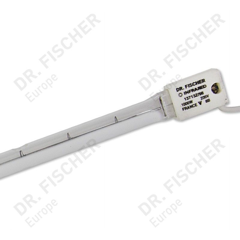 Lámpara de infrarrojos Dr. Fischer de 1000W, ideal para calefacción localizada en hogar, jardín o establos. Fabricada en Francia, con carcasa metálica y tubo de vidrio resistente. Perfecta para mantener temperaturas cálidas en espacios reducidos. Uso seguro y eficiente con voltaje de 230V.