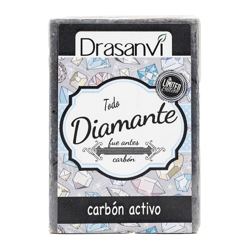 Jabón Drasanvi Carbón Activo en caja rectangular con diseño elegante de diamantes. Edición limitada que combina pureza y eficacia para una piel limpia y renovada. Ideal para cuidado diario del rostro y cuerpo. Con carbón activo para una limpieza profunda y purificante. Embalaje decorativo y sofisticado.