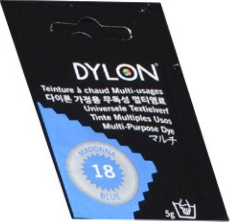 Tinte multiusos Dylon en color Madonna Blue, ideal para teñir textiles en casa. Fácil de usar con agua caliente, perfecto para dar un nuevo color a prendas de algodón, lino y otros tejidos. Paquete de 5g con instrucciones claras y diseño práctico. Ideal para proyectos de costura, decoración o renovar ropa usada.