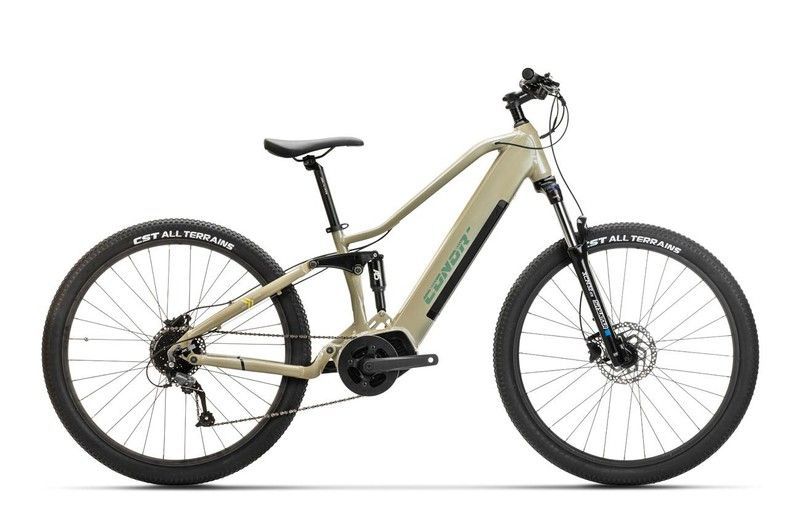 E-bike CONOR ADRA SPECIAL 29" FS 9V 504Wh MD: bicicleta eléctrica de montaña ideal para aventuras en terreno difícil. Cuadro de aluminio en beige con suspensión completa, motor central y batería de 504Wh para largas rutas. Frenos de disco hidráulicos y neumáticos anchos para mayor tracción. Perfecta para ciclistas que buscan rendimiento y comodidad