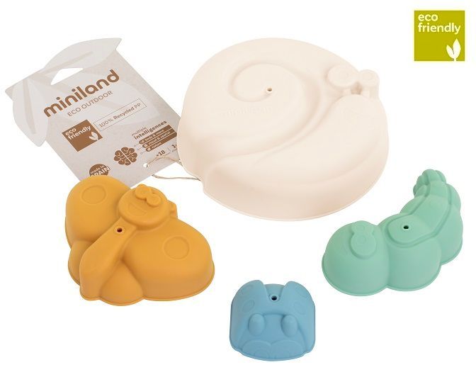 Juego de 4 moldes para arena de la marca Miniland, ideales para niños en actividades al aire libre. Hechos de plástico suave y flexible, incluyen formas divertidas como elefante, oso, cocodrilo y pez. Empaquetados en caja ecológica con diseño de hoja verde, perfectos para fomentar la creatividad en la playa o el jardín. 100% reciclable y seguro par