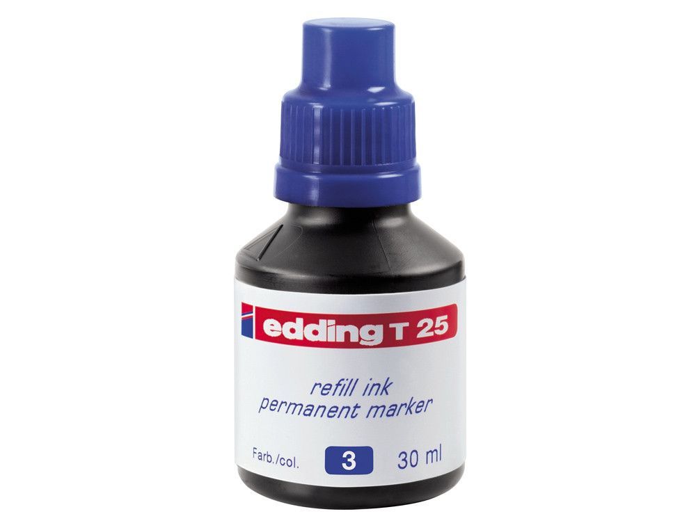 Frasco de tinta Edding T-25 de 30 ml en color azul, ideal para recargar marcadores permanentes. Diseño compacto y práctico con tapón azul y etiqueta clara. Perfecto para oficinas, escuelas y trabajos de escritura y dibujo que requieren tinta de alta calidad y durabilidad.