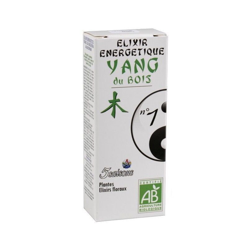 Elixir N°1 Yang de la Madera, 50 ml, un complemento energético natural certificado AB. Ideal para equilibrar la energía yang según la filosofía de los 5 elementos. En caja rectangular con diseño simbólico y detalles en verde y negro. Formulado con plantas y elixires florales, perfecto para quienes buscan armonía y vitalidad.