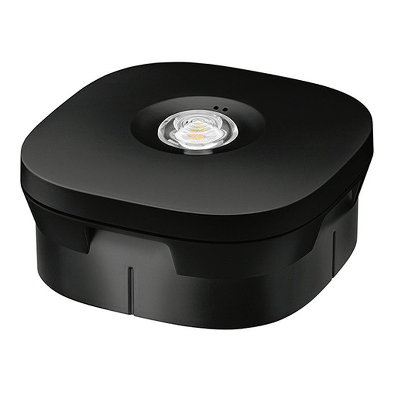 Lámpara LED Em R2a Pro Nm 134 Smh-B de diseño moderno y acabado negro mate. Ideal para iluminación interior o exterior, con luz LED central y estructura de plástico resistente. Perfecta para espacios que requieren iluminación funcional y estética.