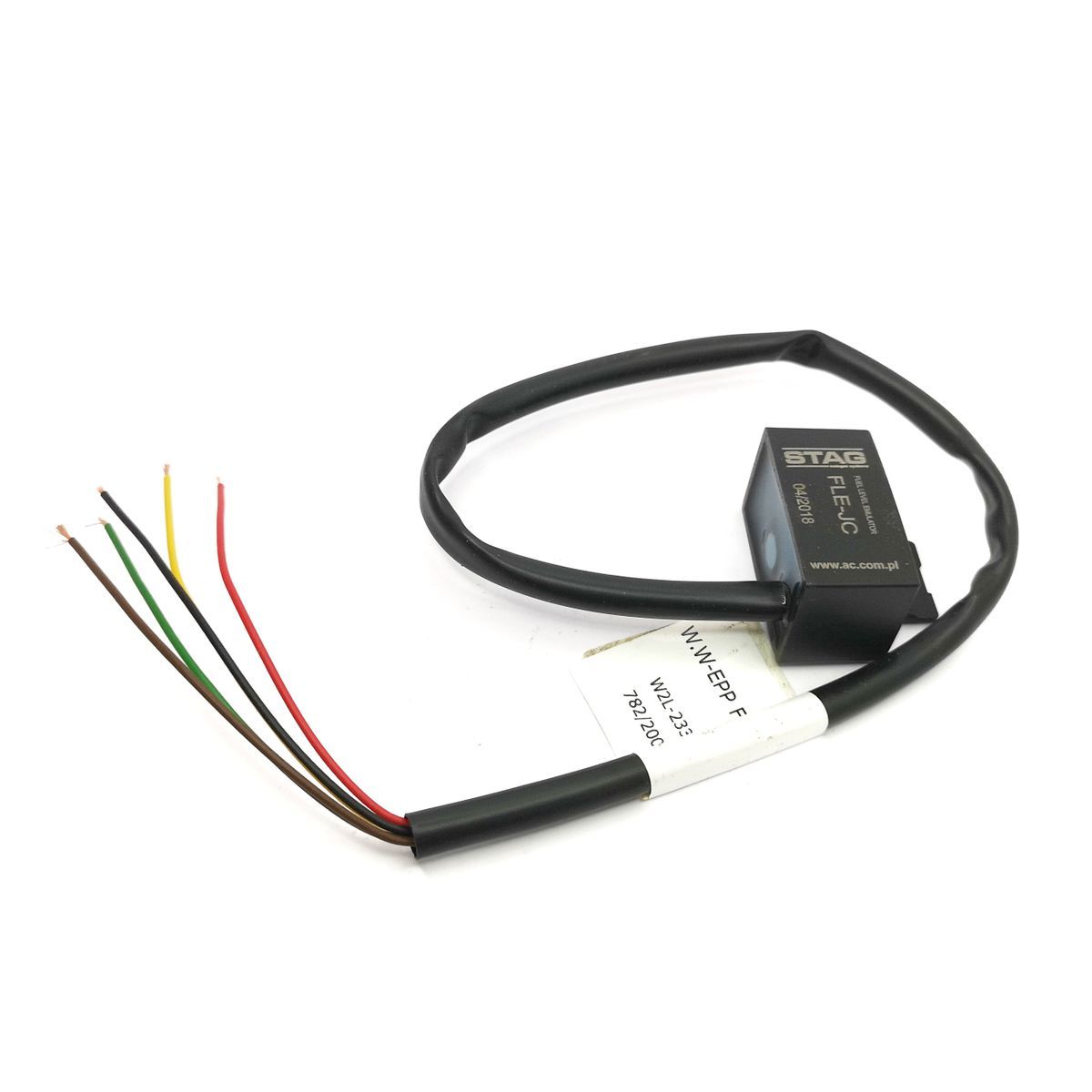 Emulador de nivel de gasolina Fle-Jc AC STAG para vehículos motorizados. Diseñado para simular el nivel de combustible en sistemas de control electrónico. Fabricado en plástico resistente con cableado multicolor para fácil conexión. Ideal para reparaciones, pruebas o mantenimiento de sistemas de combustible. Incluye etiqueta con modelo y especifica