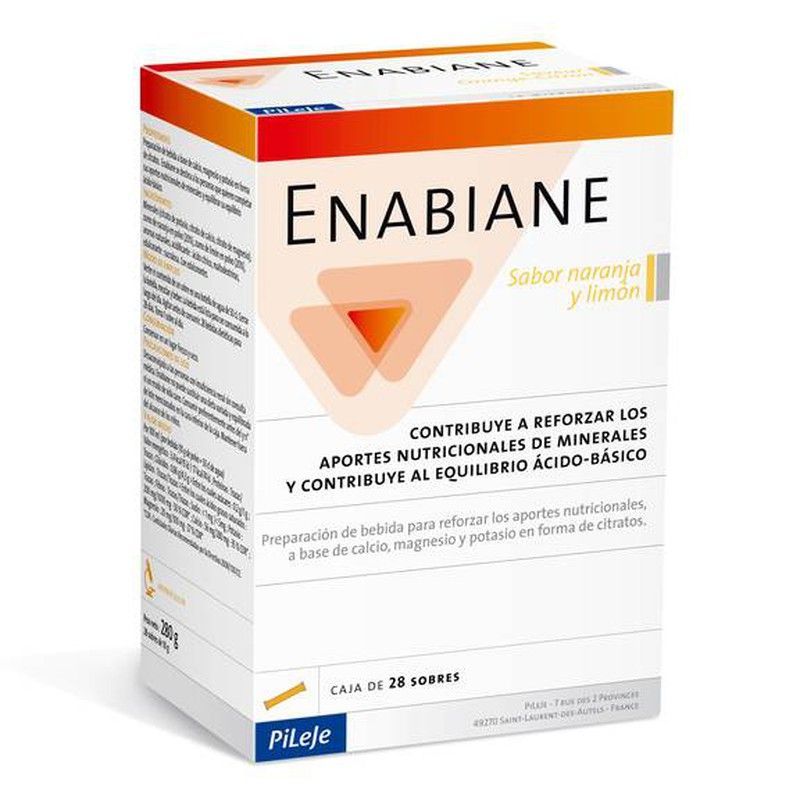 Enabiane Sabor Naranja y Limón, preparación de bebida en sobres para reforzar los aportes nutricionales de calcio, magnesio y potasio en forma de citratos. Ideal para adultos que buscan mantener un equilibrio ácido-básico y apoyar su salud mineral. Caja de 28 sobres, fácil de usar y con sabor agradable. Producto de la marca Pileje, reconocida en nu