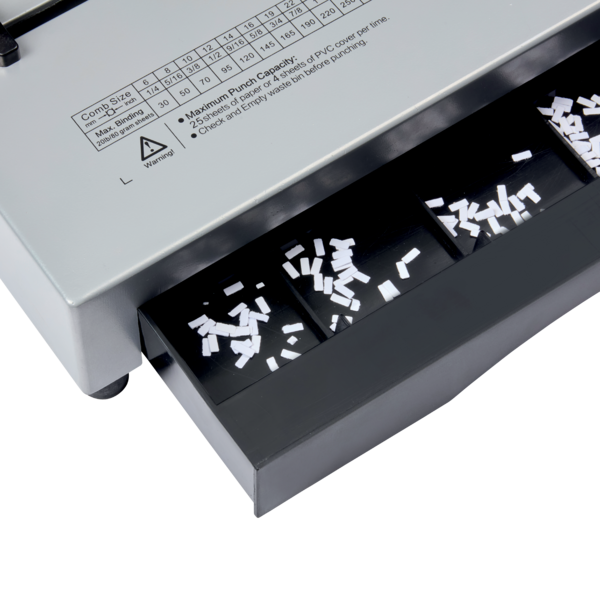 Encuadernadora canutillo GBC COMBBIND CB25 Pro, ideal para oficinas y uso profesional. Con diseño robusto en plástico y metal, permite encuadernar hasta 250 hojas o 4 rollos de cubierta de 9" por uso. Incluye cajón para recoger los canutillos sobrantes y tabla de tamaños para mayor precisión. Fácil de usar y mantener, garantiza resultados profesion