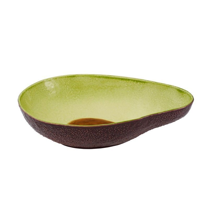 Ensaladera de loza con diseño inspirado en un aguacate, ideal para servir ensaladas, frutas o aperitivos con estilo. Con acabado mate y textura realista en el exterior, combina funcionalidad y diseño tropical. Perfecta para decorar tu mesa con un toque natural y sofisticado. Dimensiones: 34 x 23,1 x 9 cm.